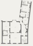Planlösningen är snarlik men inte identisk med takvåningens. Här har köket och bortre sovrummet – en gång pigkammare – bytt plats, så att man når trapphus nummer två direkt från köket.